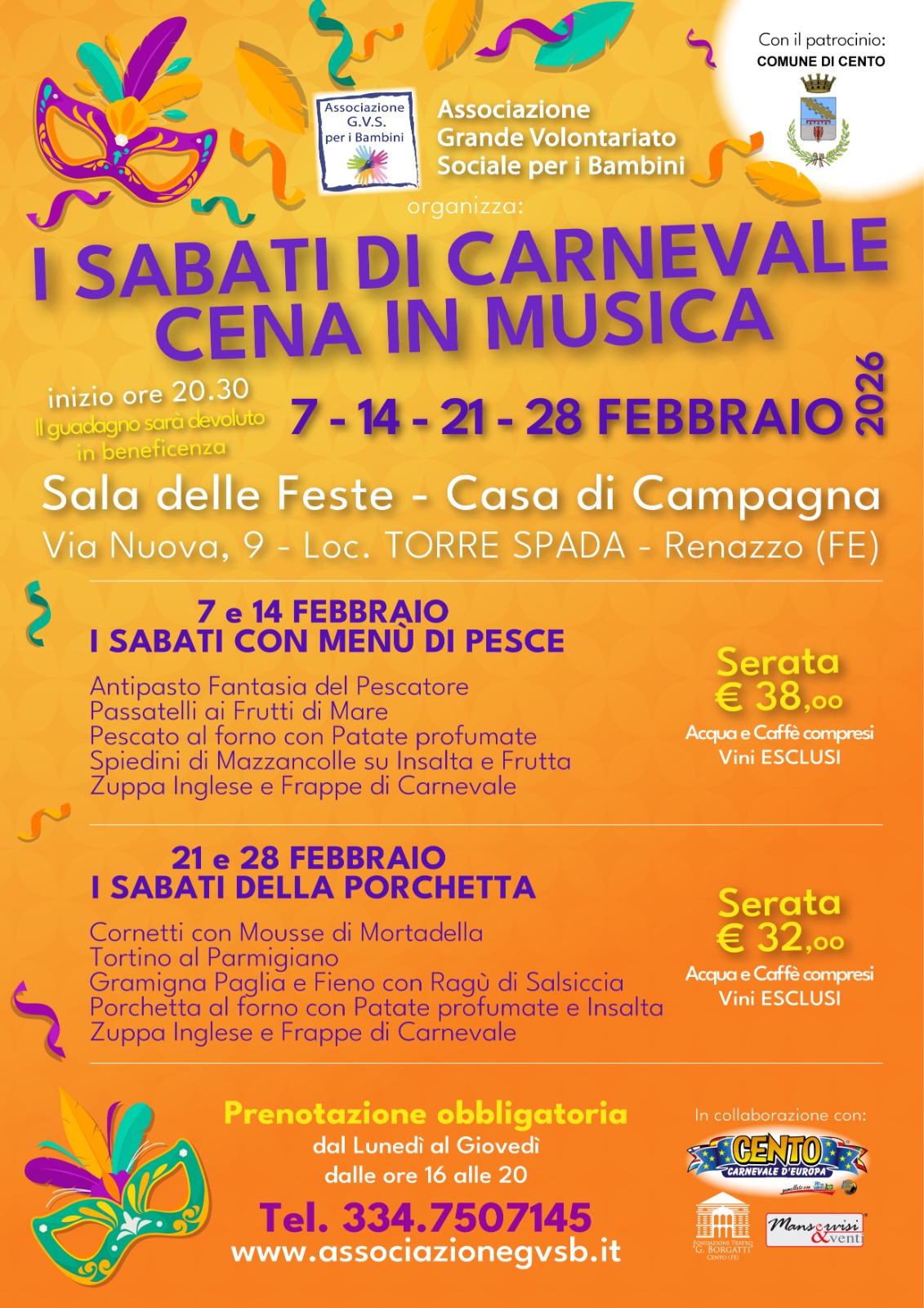 L'Associazione Grande Volontariato Sociale per i Bambini organizza sabato 28 febbraio dalle 20.30 serata e cena di carnevale presso la Sala delle Feste alla Casa di Campagna di Torre Spada.