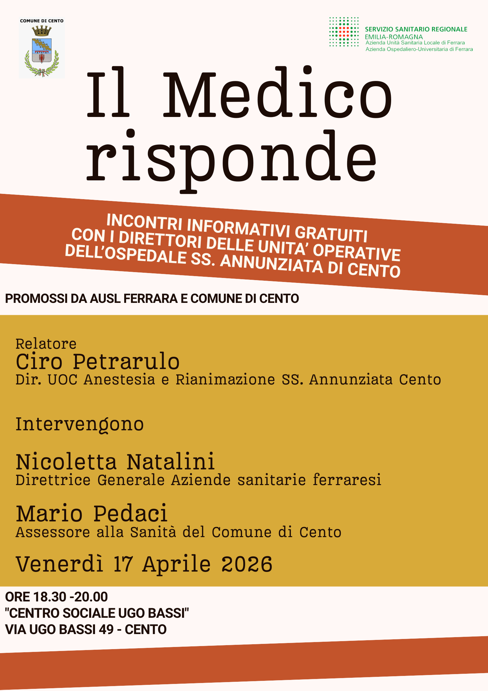 Venerdì 17 Aprile alle ore 18.30 si terrà l'incontro con Ciro Petrarulo, direttore (UOC) del reparto di Anestesia e Rianimazione dell’Ospedale SS. Annunziata di Cento. Aprirà l'incontro Nicoletta Natalini, Direttrice Generale delle Aziende sanitarie ferraresi e interverrà Mario Pedaci, Assessore alla Sanità del Comune di Cento.