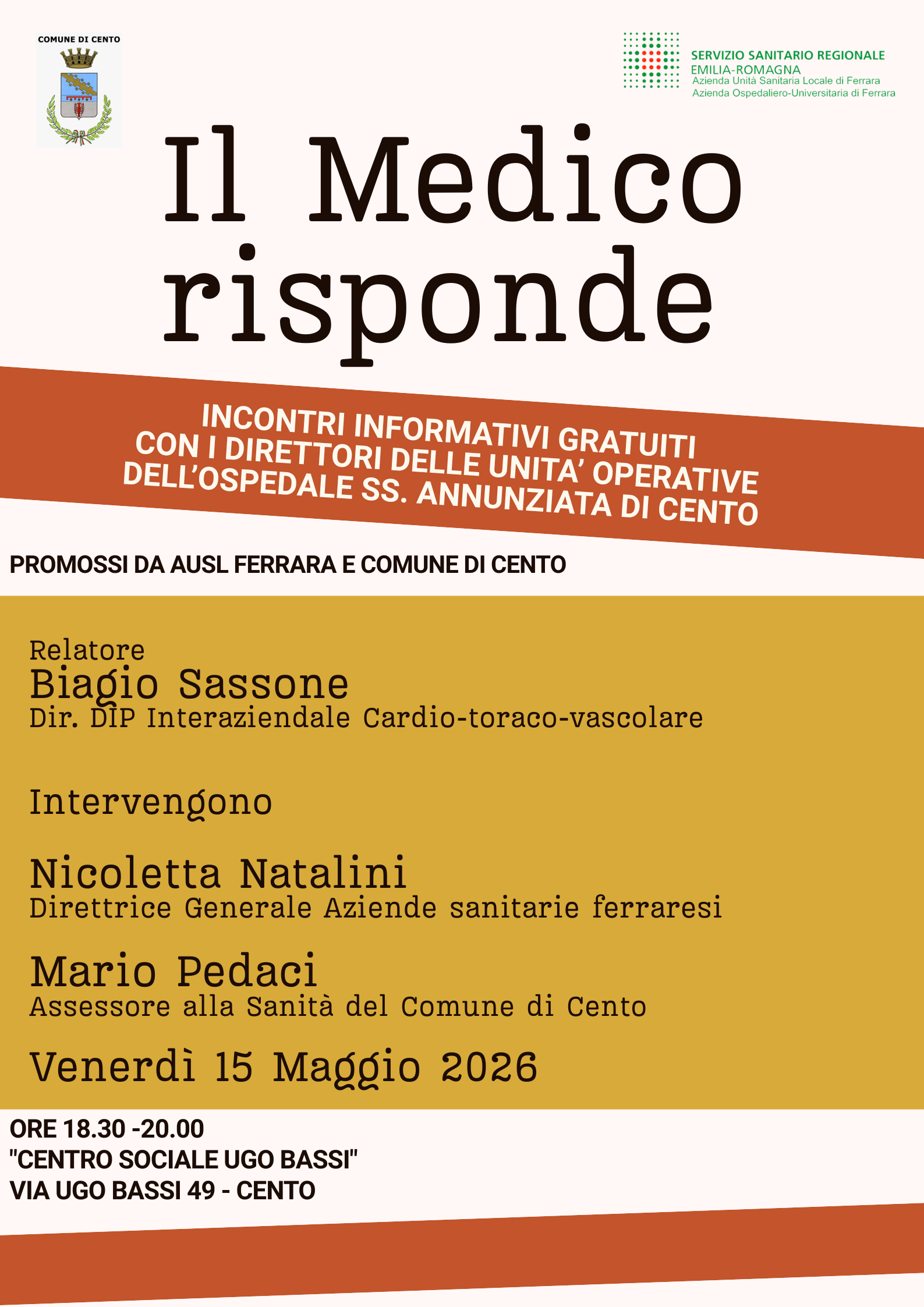 Venerdì 15 Maggio alle ore 18.30 si terrà l'incontro con Biagio Sassone, direttore del dipartimento intenrazionale cardio-toraco-vascolare. Aprirà l'incontro Nicoletta Natalini, Direttrice Generale delle Aziende sanitarie ferraresi  e interverrà Mario Pedaci, Assessore alla Sanità del Comune di Cento.