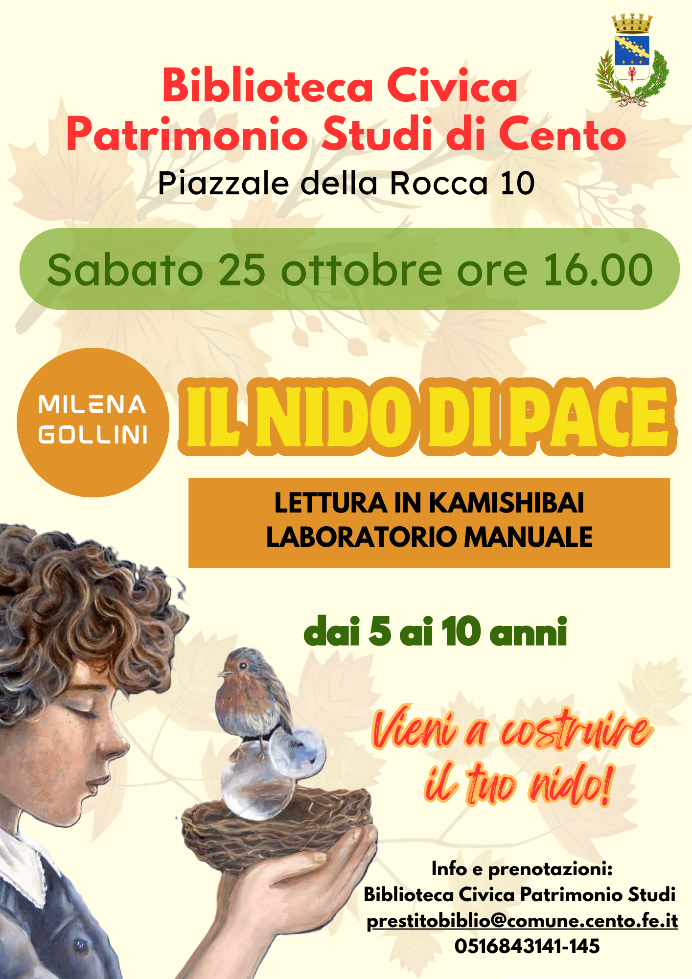 Sabato 25 ottobre alle ore 16.00 presso la Biblioteca Civica Patrimonio Studi di Cento (Piazzale della Rocca, 10) Milena Gollini, autrice dell'albo "Il nido di pace" con illustrazioni di Silvia Arbizzani leggerà il libro con la tecnica del kamishibai (“spettacolo teatrale di carta”).