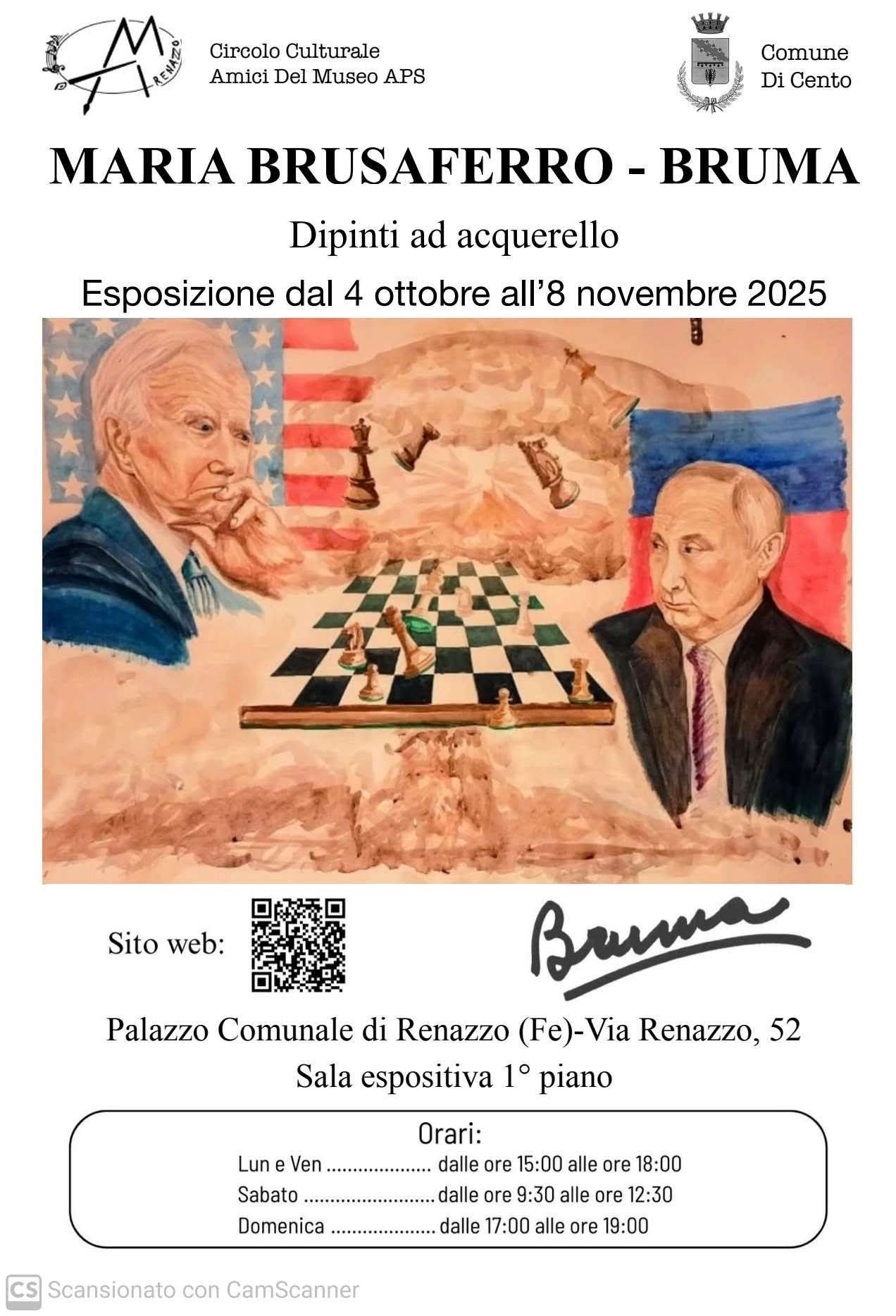 L'artista Maria Brusaferro, in arte Bruma, vive a San Giovanni in Persiceto, dove lavora. Amante della tecnica dell'acquerello, espone i suoi dipinti nella sala Espositiva della Casa Comunale di Renazzo (via Renazzo 52) una serie di delicate realizzazioni dai colori caldi e soffusi.