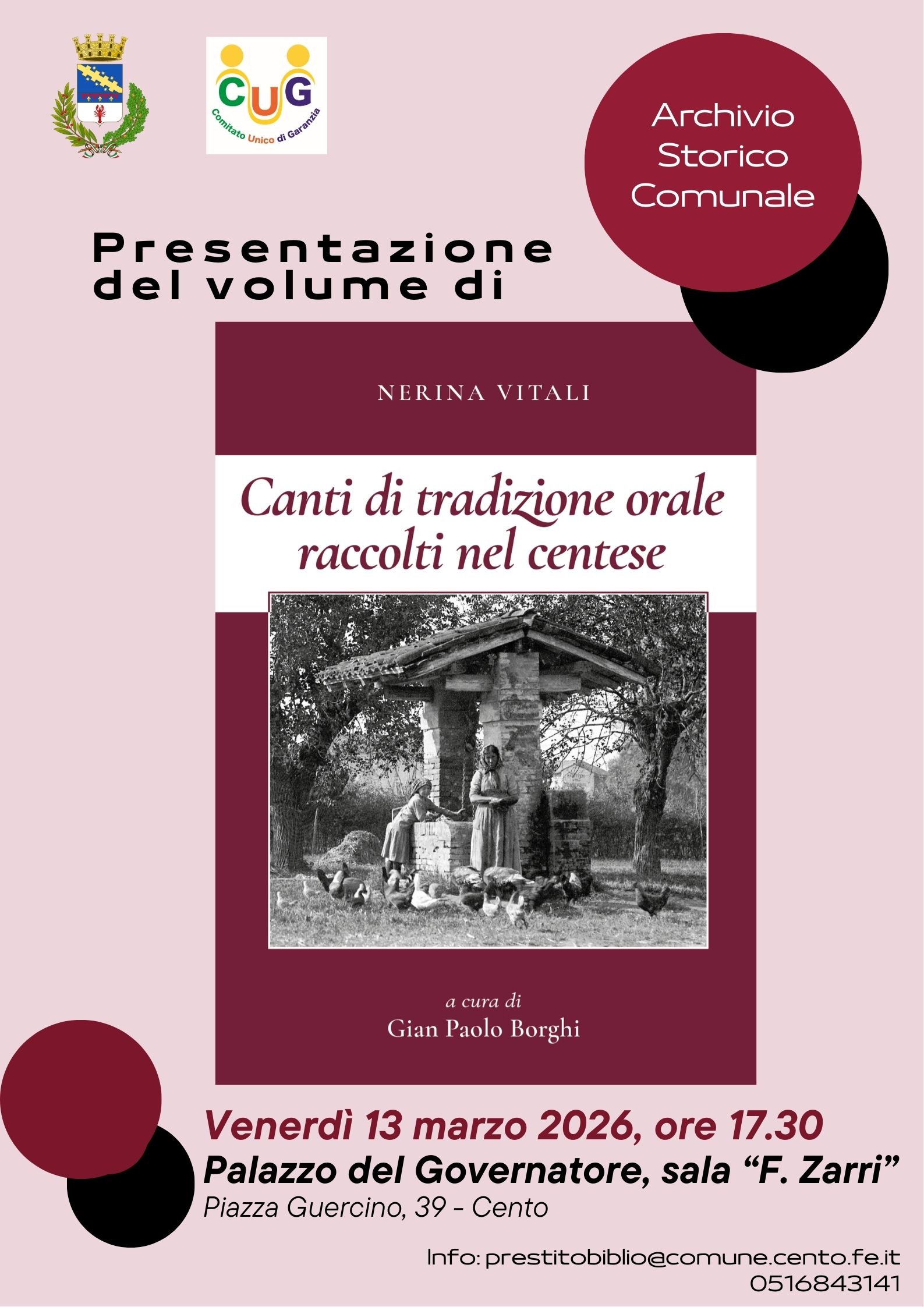 In occasione della Festa della Donna, Venerdì 13 marzo ore 17.30, nel Palazzo del Governatore in Sala Zarri, si terrà la presentazione del volume di testi inediti di Nerina Vitali, “Canti di tradizione orale raccolti nel Centese”, a cura di Gian Paolo Borghi.