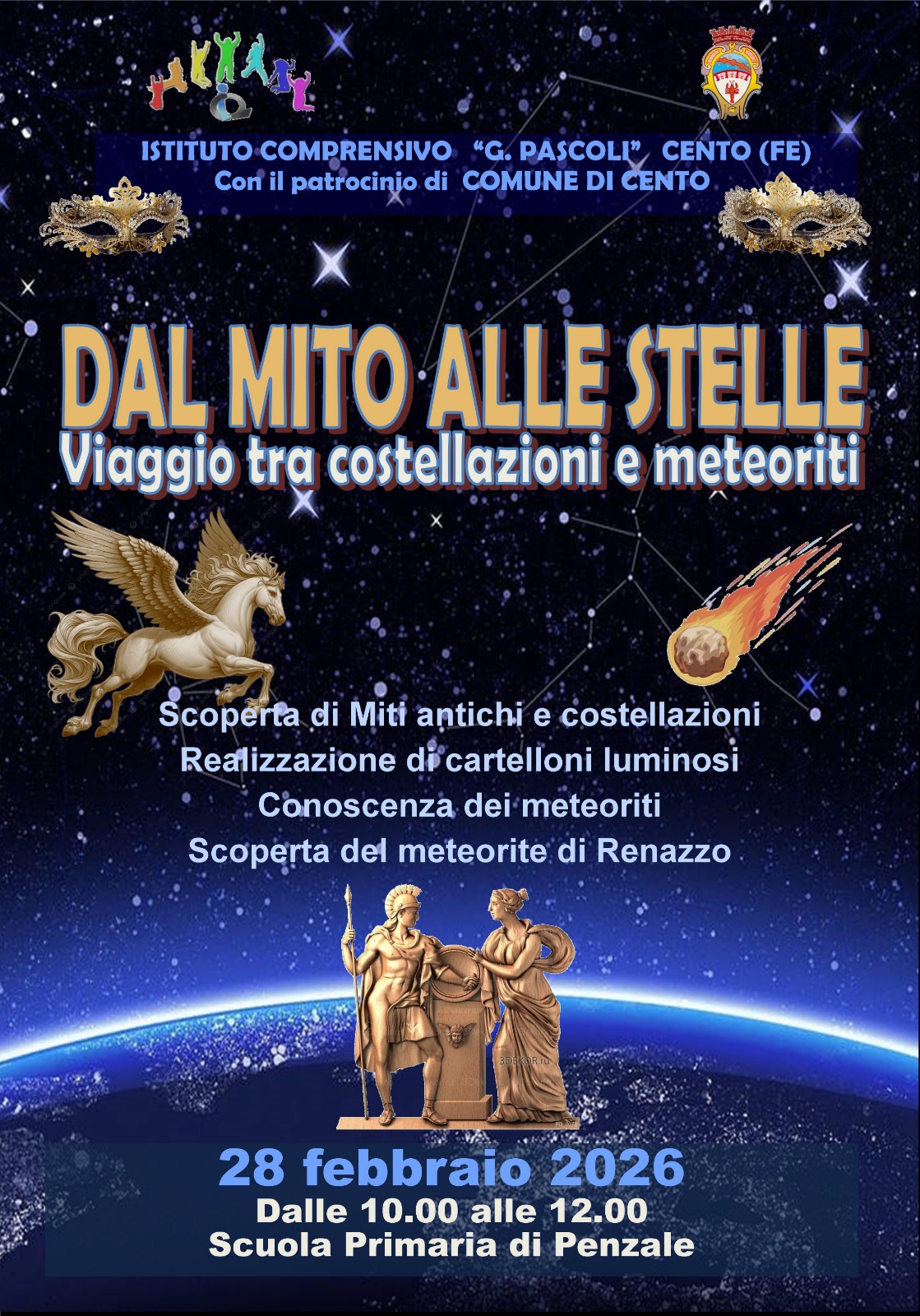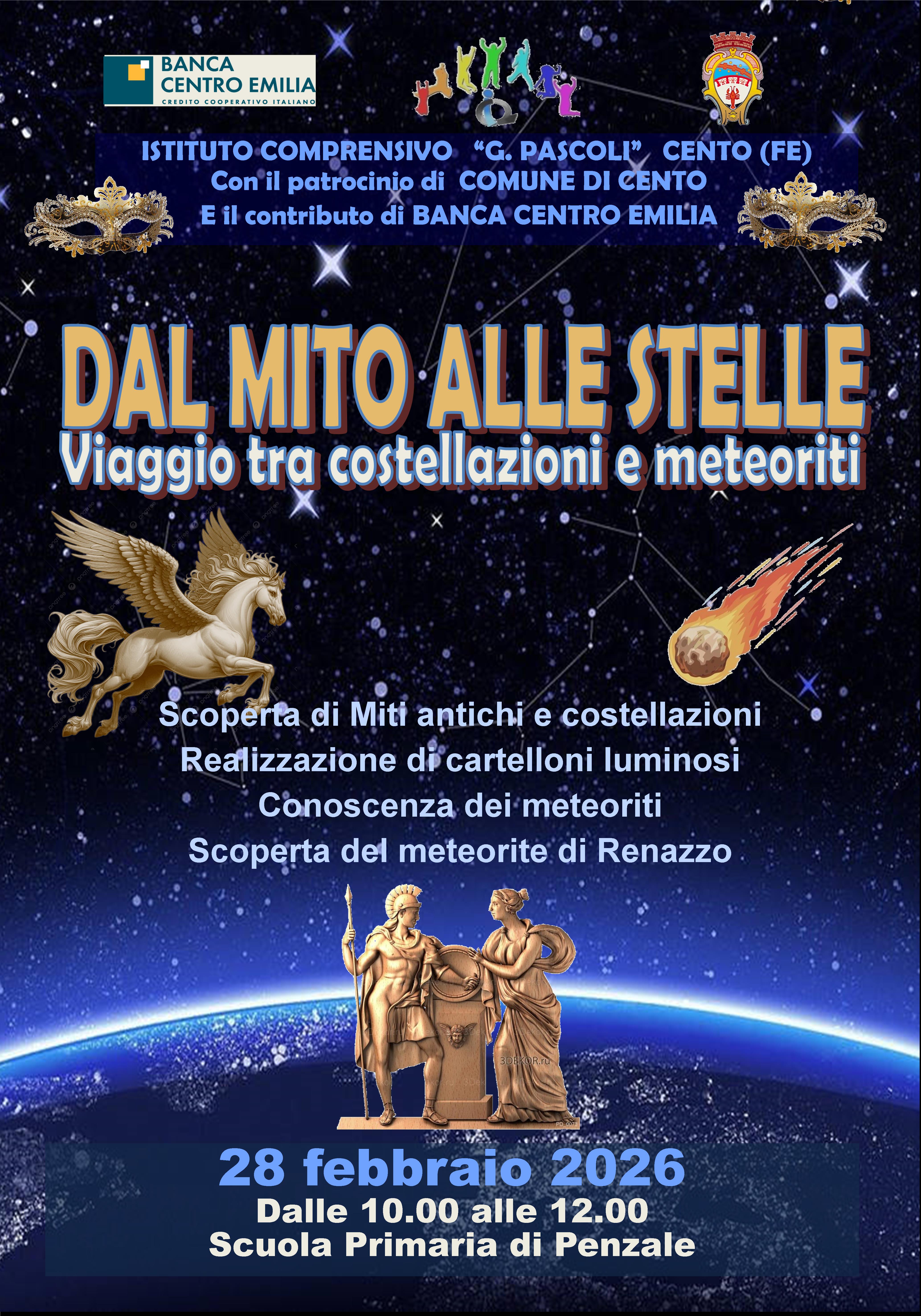 Sabato 28 febbraio 2026, dalle ore 10.00 alle 12.00, presso la Scuola Primaria di Penzale, l’Istituto Comprensivo “G. Pascoli” di Cento, presenta “Dal mito alle stelle – Viaggio tra costellazioni e meteoriti”, un’iniziativa dedicata alla scoperta del cielo e delle sue meraviglie, in collaborazione con l'Associazione Astrofli centese.