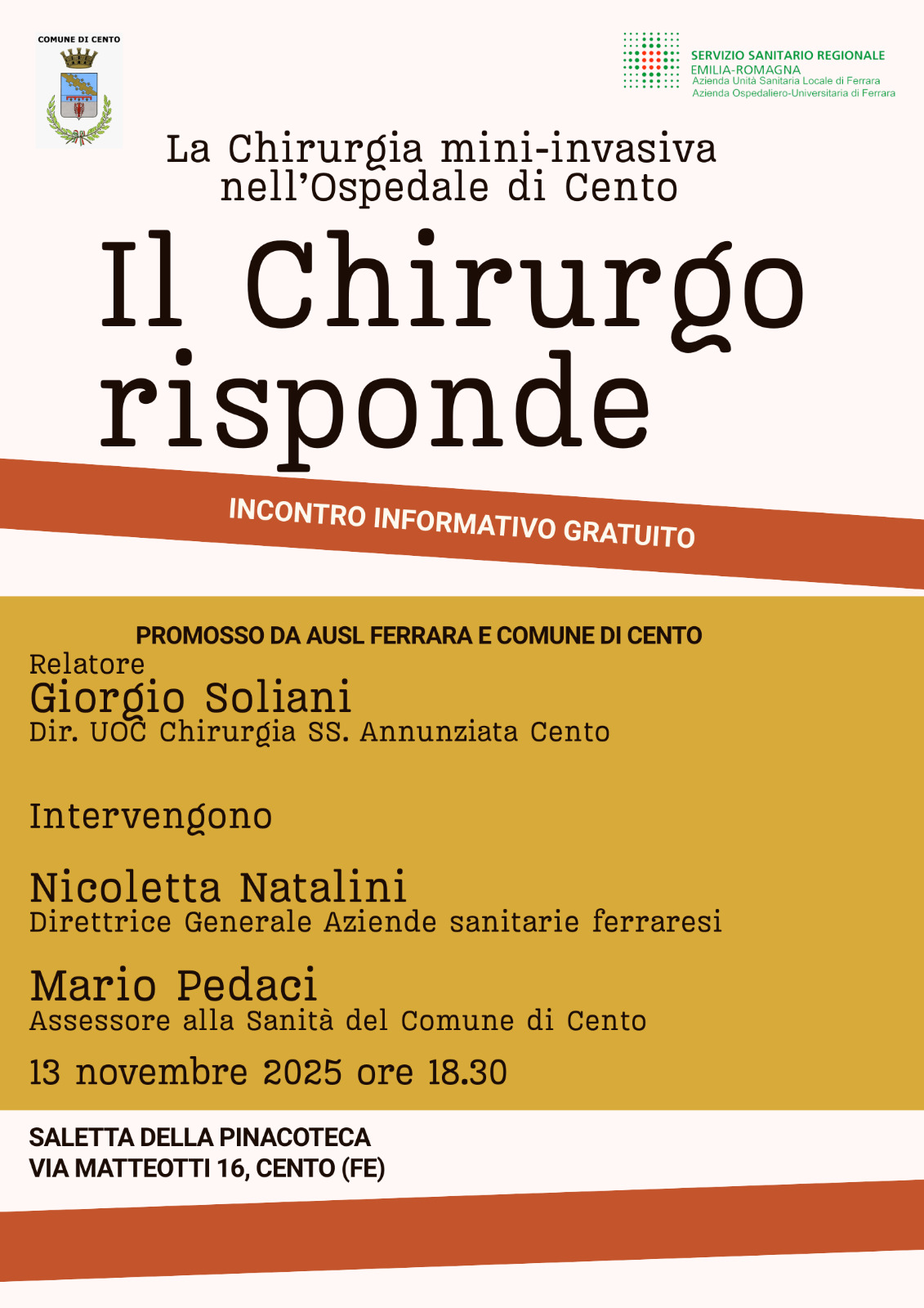 L’incontro, a carattere divulgativo e aperto alla cittadinanza, offrirà un momento di informazione e dialogo sulle principali attività chirurgiche svolte presso l’Ospedale di Cento, con particolare attenzione alle tecniche mini-invasive oggi utilizzate. Dopo una breve introduzione, il Dott. Soliani risponderà alle domande del pubblico.
