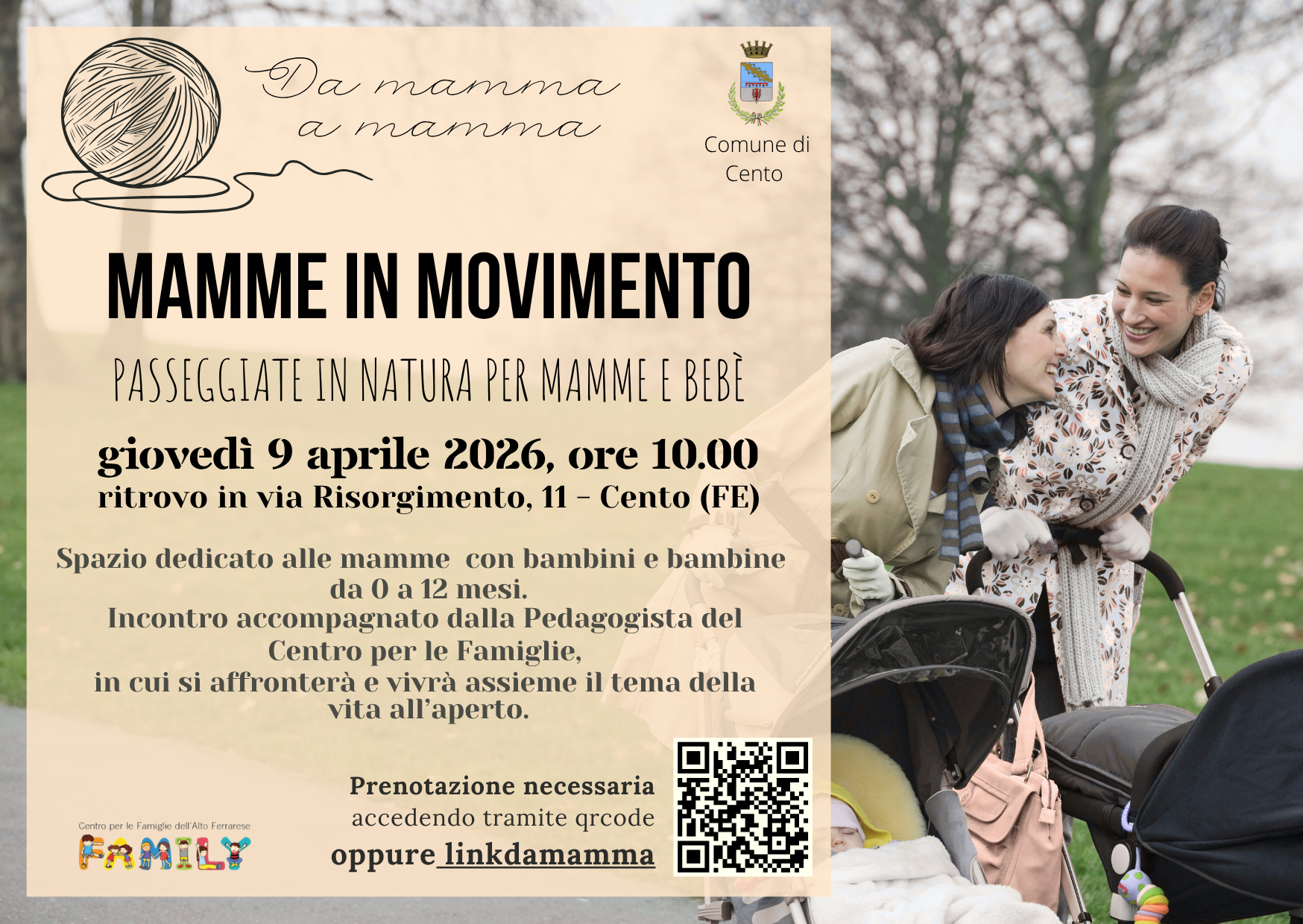 Per iscriversi all'incontro di Giovedì 9 aprile 2026, ore 10.00 Mamme in movimento, occorre accedere al modulo online tramite qrcode presente sulla locandina o al seguente link: