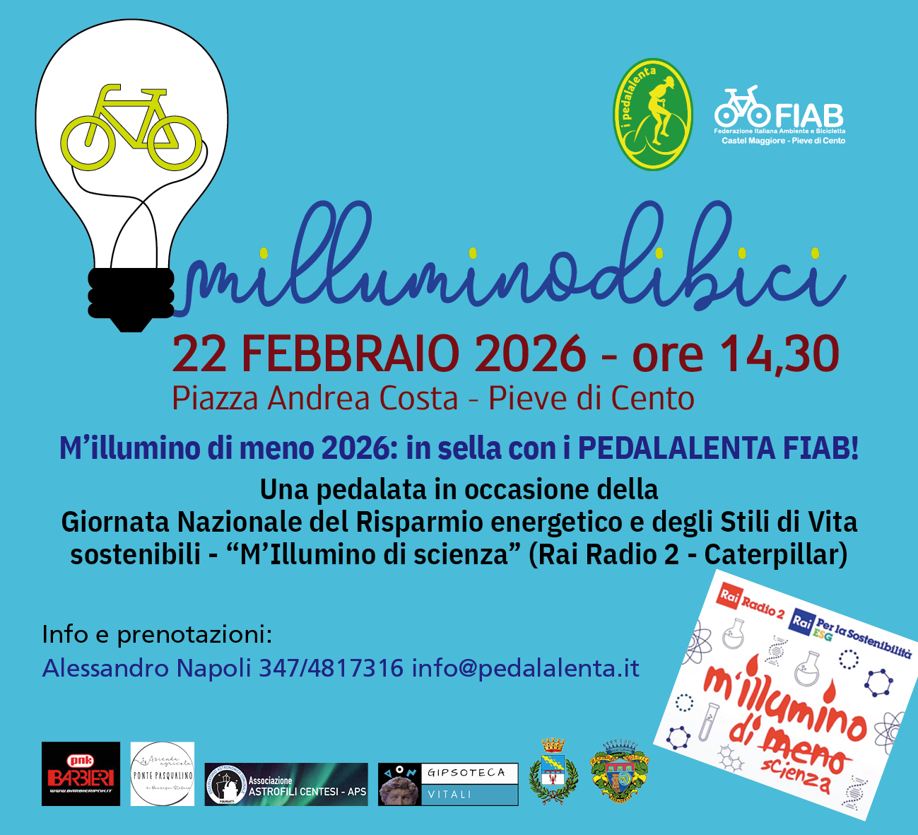 L'Associazione I Pedalalenta, con il patrocinio dei Comuni di Pieve di Cento e di Cento, organizza il giorno 22 Febbraio 2026 alle ore 14:30 una facile pedalata volta alla sensibilizzazione verso i temi relativi alla sostenibilità ambientale ed alla promozione della mobilità ciclabile/dolce del territorio!