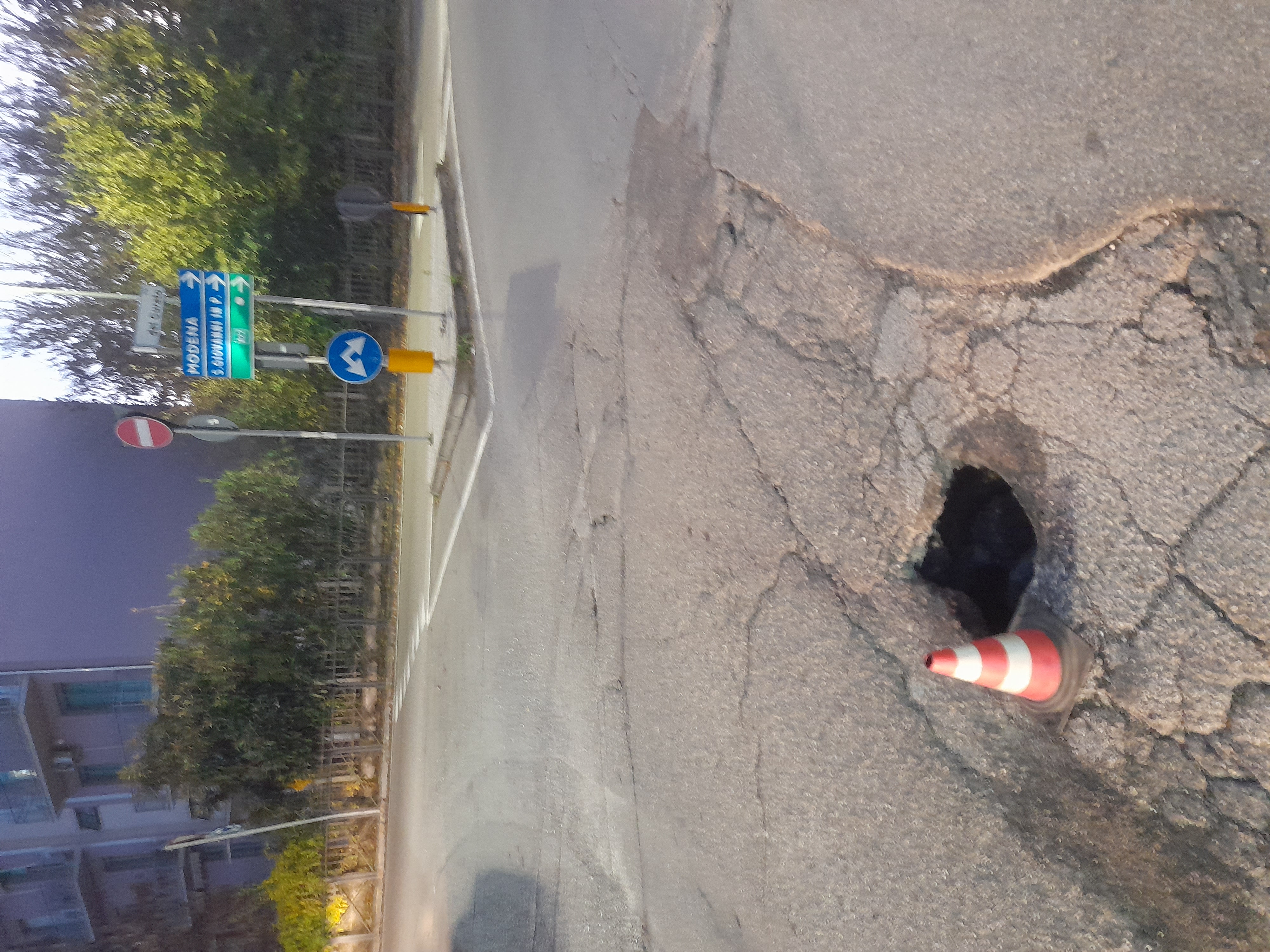 Causa cedimento dell'asfalto all'interno della rotatoria di Via Del Curato/ Via Bologna a Cento capoluogo, sulla parte esterna della sede stradale della rotatoria stessa, con interessamento del ramo che porta su Via del Curato i veicoli che vanno in direzione di Via Modena,è intervenuta Hera Pronto INtervento per una messa in sicurezza immediata.